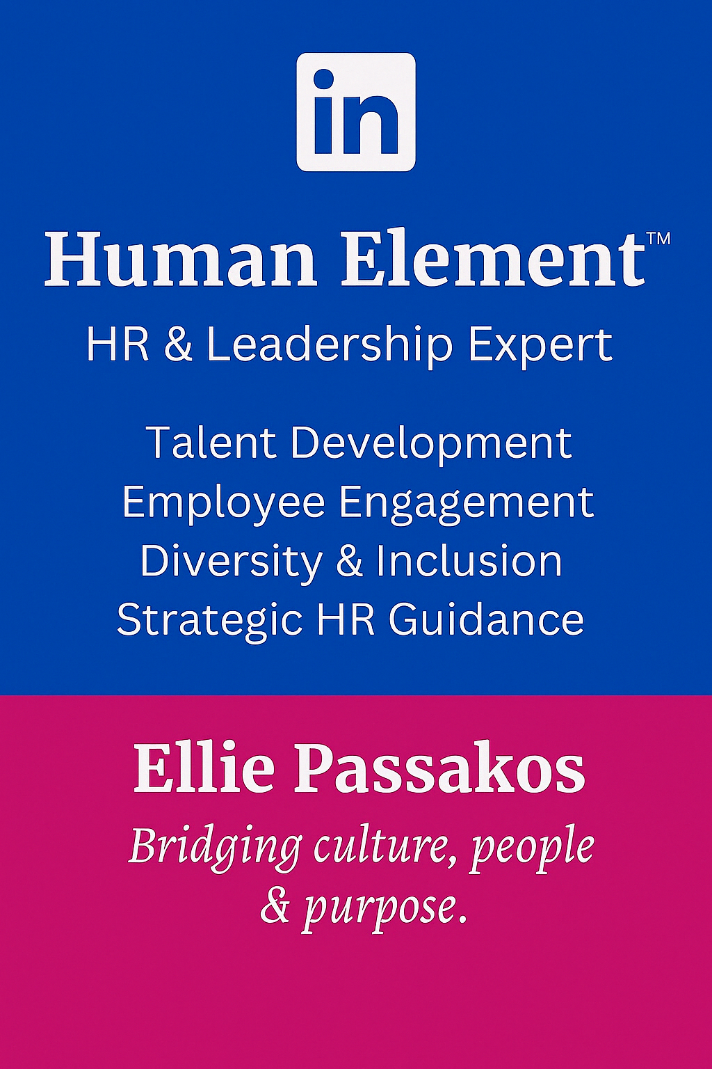 I am Eleni (Ellie) Passakos – HR Strategist, People & Culture Leader, and creator of the Human Element™ framework. Born in Athens with Greek–Cypriot roots and shaped by a deeply multicultural life, I believe that human connection is the most powerful driver of leadership, performance, and organizational resilience.